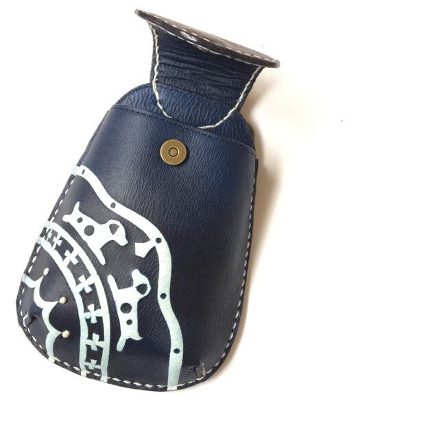 ★ひとつひとつ手作業で、柔らかい牛革を藍で型染めし、一部アクセントにフレンチノット刺繍を施したモバイルケースです。(ジャックラッセルテリアモチーフ)