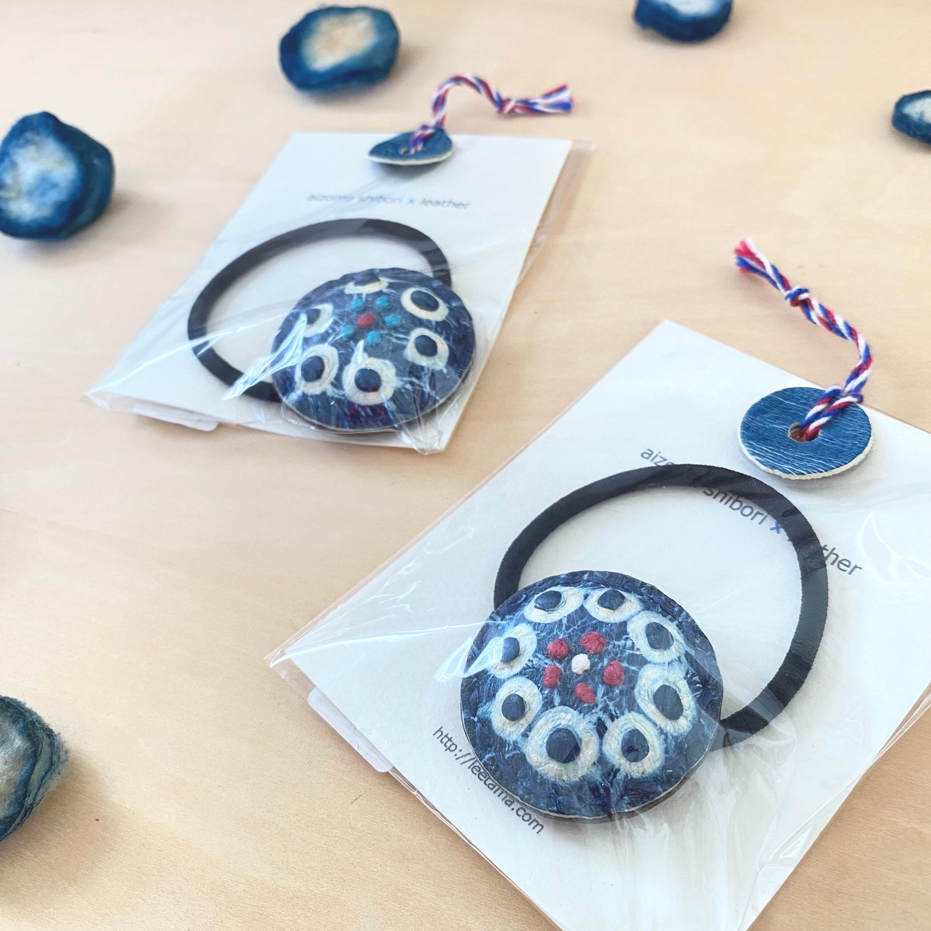 ★ひとつひとつ手作業で、柔らかい豚革を藍で絞り染め(豆絞り:実際に小豆を入れて絞ります)し、フレンチノット刺繍、そして内側にも芯材を入れて立体的に膨らみを持たせたヘアアクセサリーです。