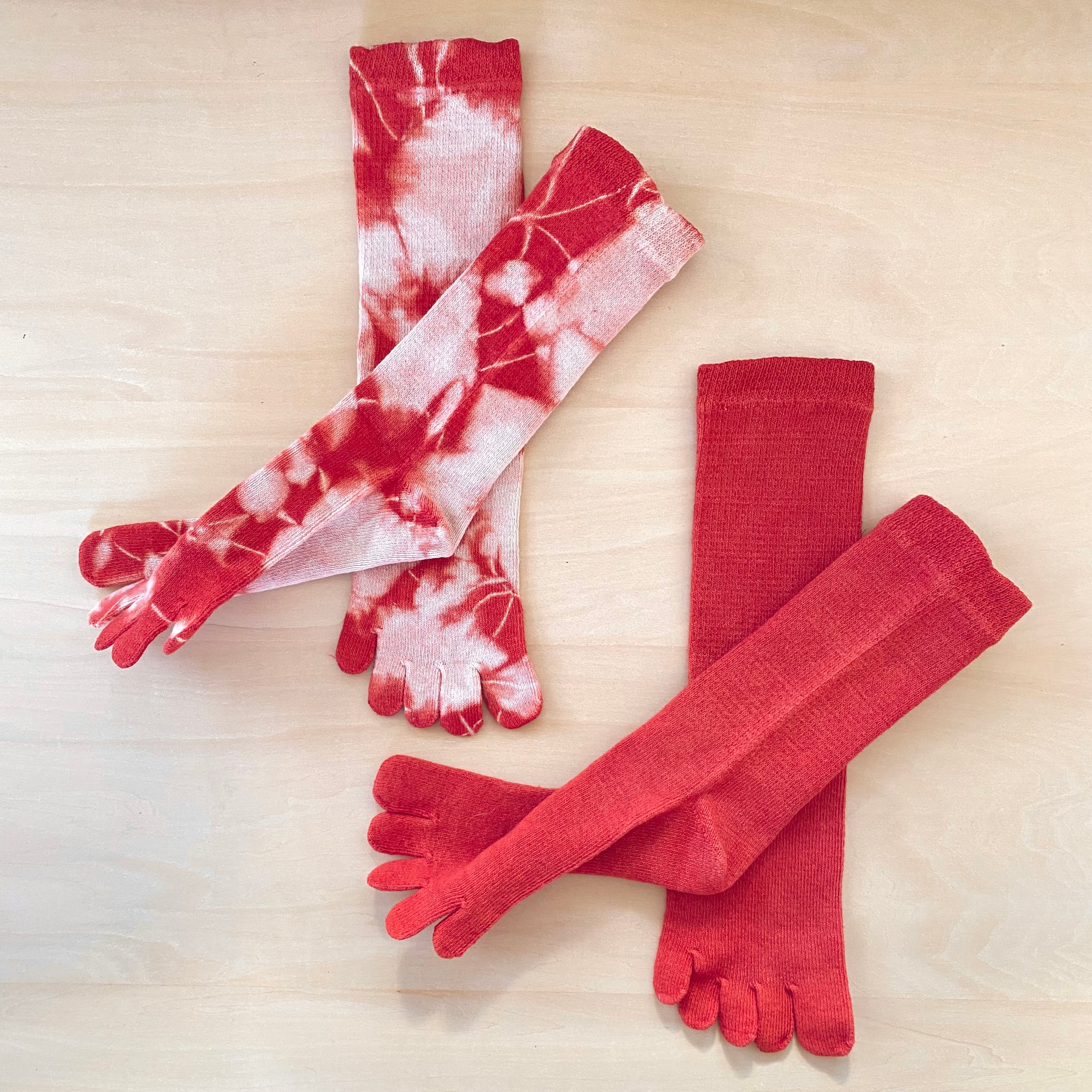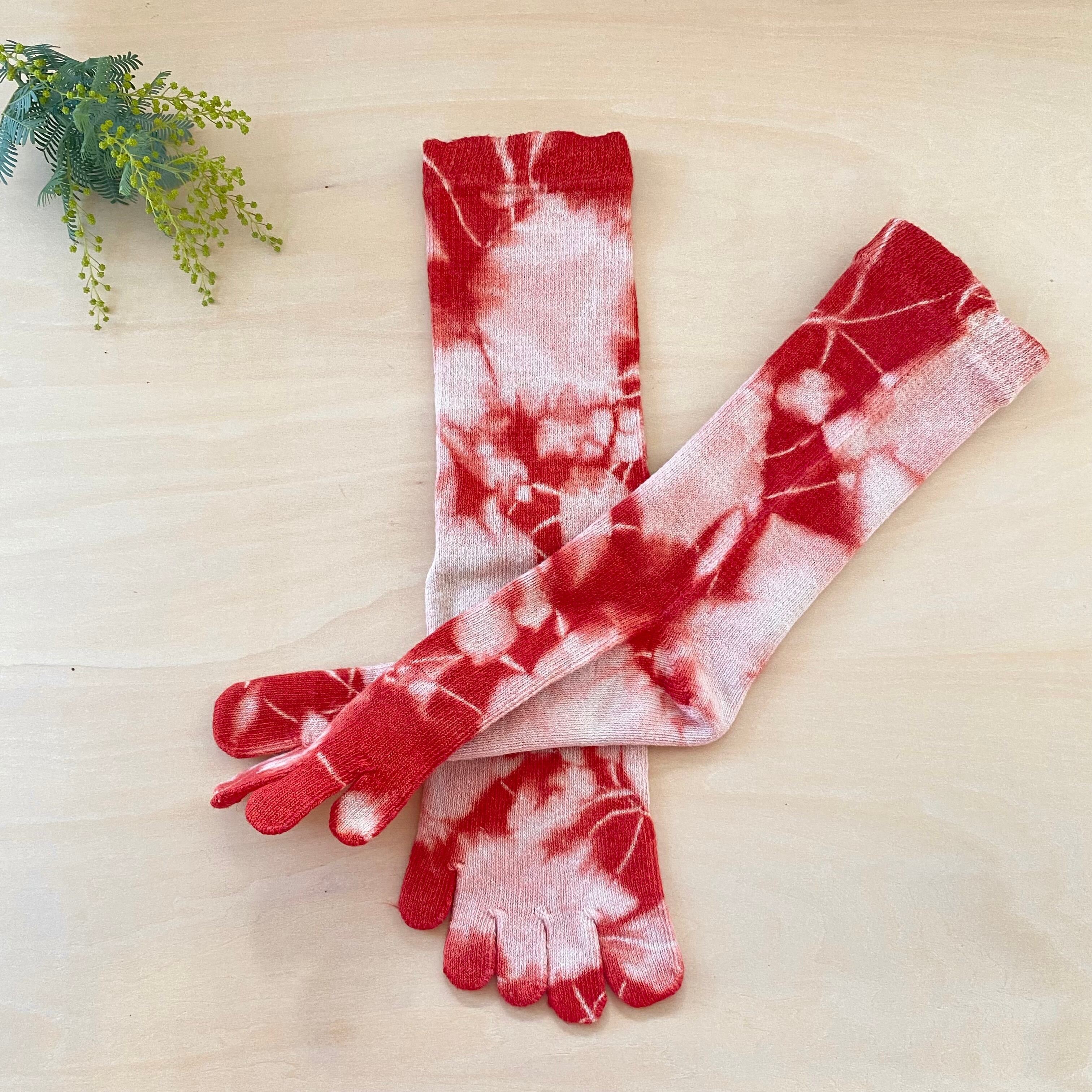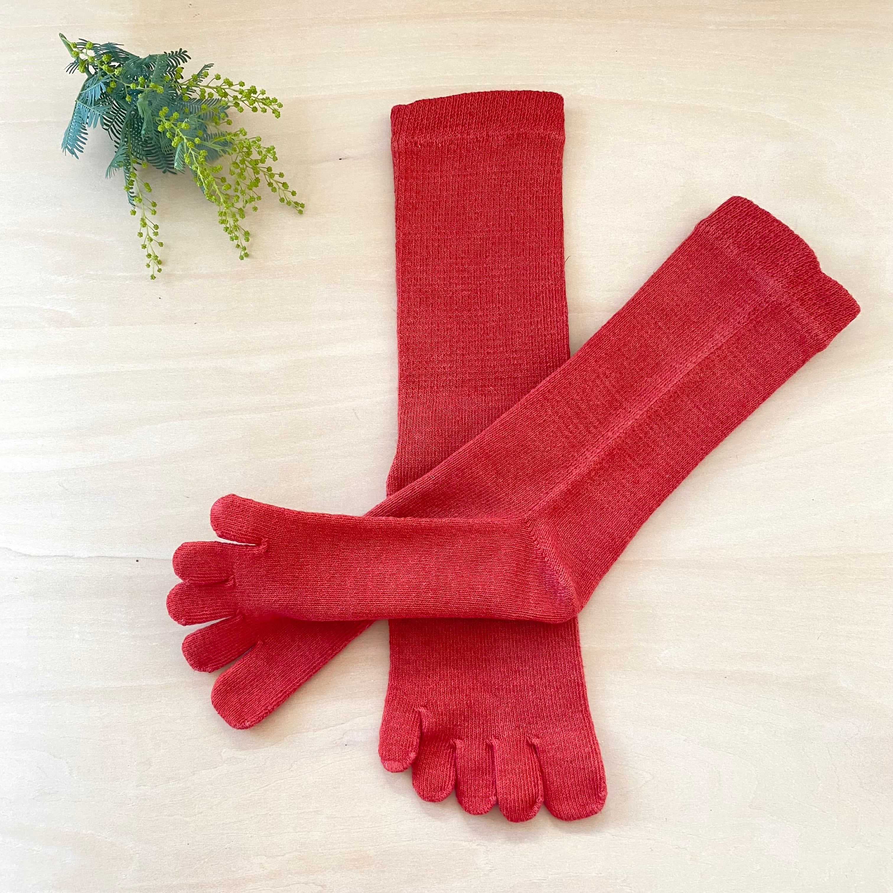 製造過程でEM加工が施されたヘンプ×コットンの靴下を茜染めしております。